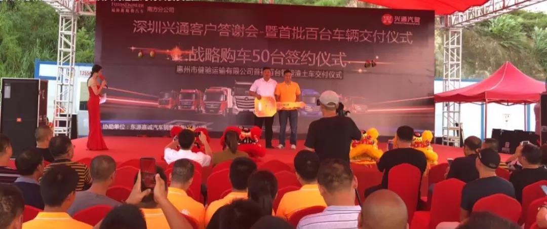 9月9日,欧曼授权经销商深圳兴通客户答谢会暨首批100台车辆交付仪式、战略购车50台签约仪式在广东惠州大亚湾举行。来自福田戴姆勒汽车等相关领导,核心区域经销商及行业权威客户等百余位嘉宾莅临活动现场,共同见证了此次交车暨签约仪式。这是欧曼全新智能渣土车继上市后,在加速推进“蓝天工程”建设中的又一建设性行动。