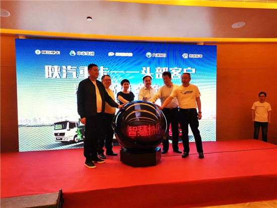 陕重汽副总经理兼销售公司总经理周银朝、中泰化学蓝天物流有限公司董事长李芸华、新疆神华能源集团副总经理安霖、新疆保利陆铁港集团董事长叶浩共同启动了签约仪式。