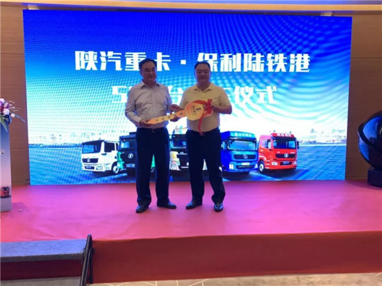 陕重汽副总经理兼销售公司总经理周银朝在热烈的掌声中,向新疆保利陆铁港集团董事长叶浩递交了象征着精诚合作、共创辉煌的金钥匙。