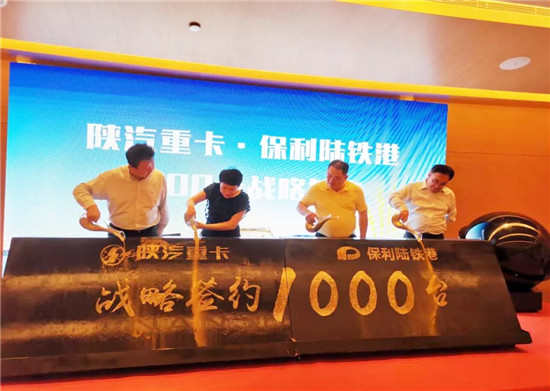 陕重汽副总经理兼销售公司总经理周银朝与新疆保利陆铁港集团董事长叶浩签署1000辆购车协议。