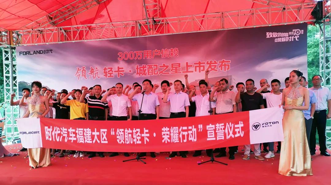 发布会现场,时代汽车福建大区的工作人员还召开了“领航轻卡·荣耀行动”誓师仪式,“践行福田营销“赢“文化,发扬榕树精神,“坚定目标、坚韧不拔、百折不挠、勇夺第一、捍卫荣耀!”激情澎湃的宣誓词表达了福建大区勇夺销量第一的决心,也体现了时代工作人员对领航轻卡·城配之星产品的信任。