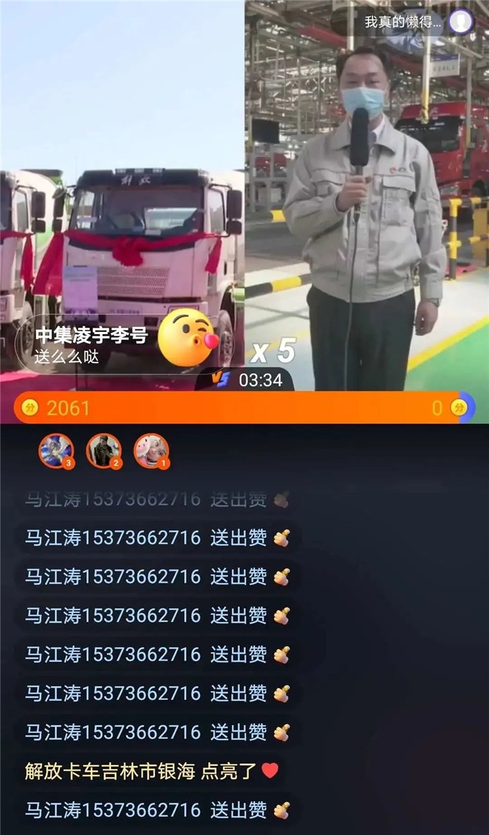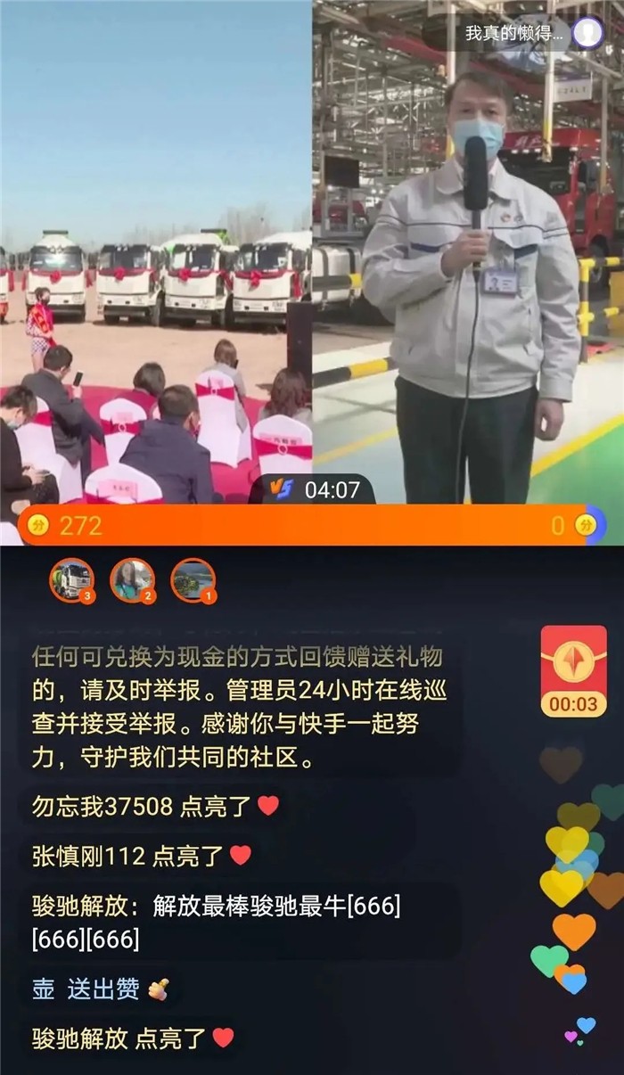 一汽解放制造物流部部长董国旗,在一汽解放卡车间与现场进行了连麦,他在直播中说到,一汽解放有国内最好的制造装备、最牛的产业工人,最好的管理队伍,全球最快的卡车生产节拍,可以用最短的制造周期,满足广大卡友的购车需求。一汽解放努力为广大客户提供质量最优的产品、周期最短的交付、感动至上的服务。产品是解放人干出来的,口碑是大家赞出来的,成绩是广大卡友捧出来的,一汽解放会不忘初心,为广大卡友提供更好更强的产品及服务。