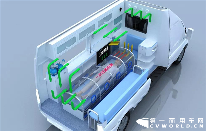 在特定的负压装置下,负压救护车的后舱气压低于救护车舱外的气压,从而保证外界的新鲜空气的定向流入,后舱内被患者或疑似患者污染过的空气或污染的气溶胶不会随意泄露可以有效避免更多的人感染,对传染病源起到良好的控制作用。