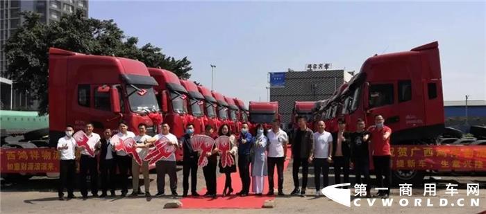 4月27日,在广西防城港鸿祥物流园,东风商用车西部营销中心广西商代处携手广西通海汽车销售有限公司向客户批量交付20辆东风天龙KL。