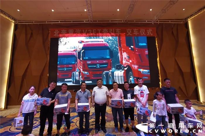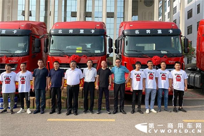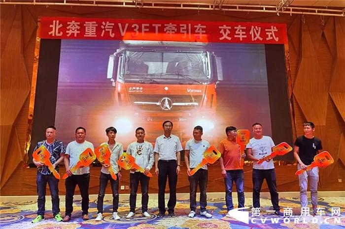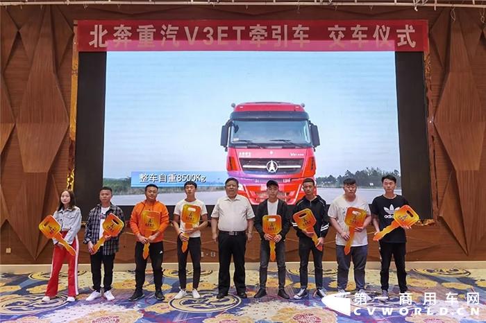 5月23日,北奔重汽携手昆明华刚、曲靖金砖汽贸在云南曲靖成功举办了50辆V3ET牵引车交车仪式。