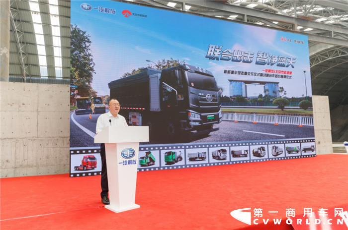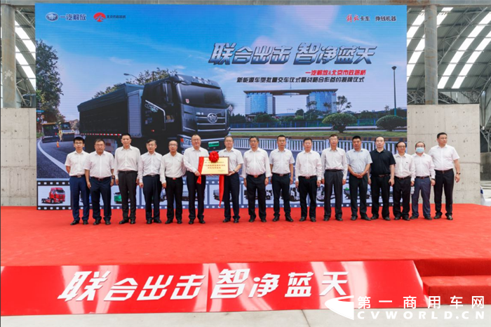 一汽解放集团股份有限公司总经理朱启昕向北京市政路桥集团党委副书记、总经理王健中,授予“一汽解放新能源商用车示范运营基地”牌匾,并举行授牌