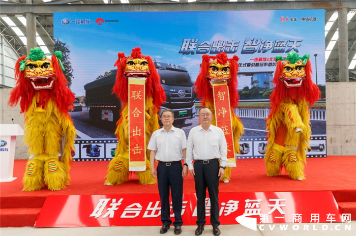 一汽解放集团股份有限公司总经理朱启昕与北京市政路桥集团党委副书记、总经理王健中分别致辞拉开活动大幕,并同时为祥狮点睛,寓意着开启双方深化合作及助力首都蓝天保卫的美好旅程。