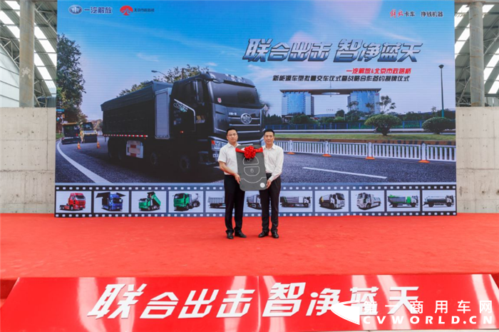 一汽解放汽车销售有限公司京津冀商代处总经理李雷与北京晨曦兴拓建筑工程材料有限公司总经理陈晓阳进行解放纯电动新能源重卡批量交车仪式。标志着一汽解放纯电动新能源重卡首秀首都之后的再一次高光时刻。