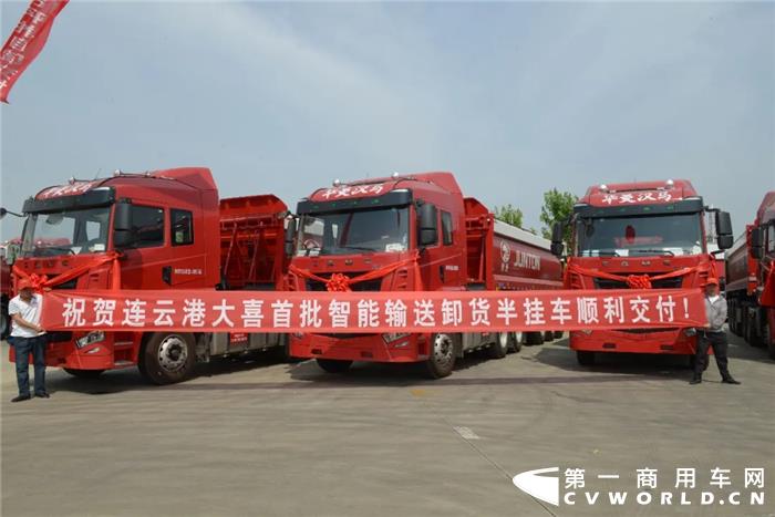 鑫顺通公司是连云港港口较大的选矿企业,该公司对车辆的规范化运营要求较高,此次经过多方比较,最终花落华菱星马,批量采购100辆,此次交车是首批20辆车。