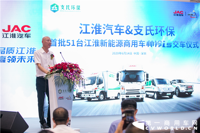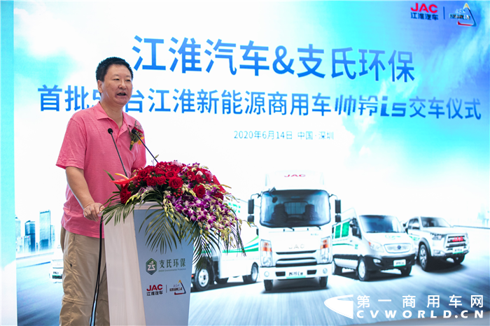 支占利代表支氏环保致辞。他表示,一直以来,支氏环保始终秉承“诚信为本、品质为先、创新为要、合作为赢”的核心价值观,以具有领先水平的垃圾处理技术和卓越品质的环卫专用设备,支承环保大业,共筑绿色未来!在江淮汽车与支氏环保、德盈利环保、深兄环境、友志达实业、国民公司与江淮新能源商用车交车仪式的欢庆时刻,我们将为深圳环保事业贡献更大的力量。