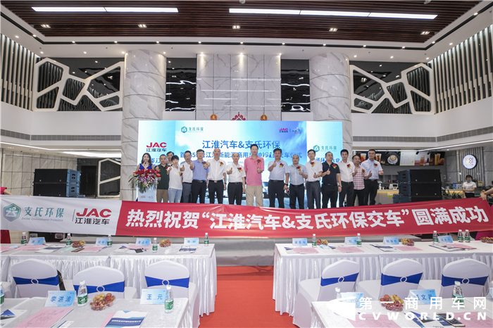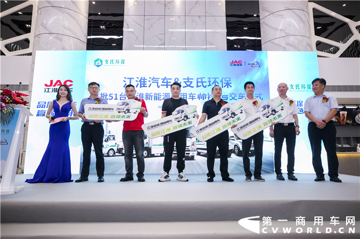 安徽江淮汽车集团轻型商用车营销公司党委副书记华中应、深圳市支氏环保科技有限公司总经理支占利共同为用户交付车辆钥匙