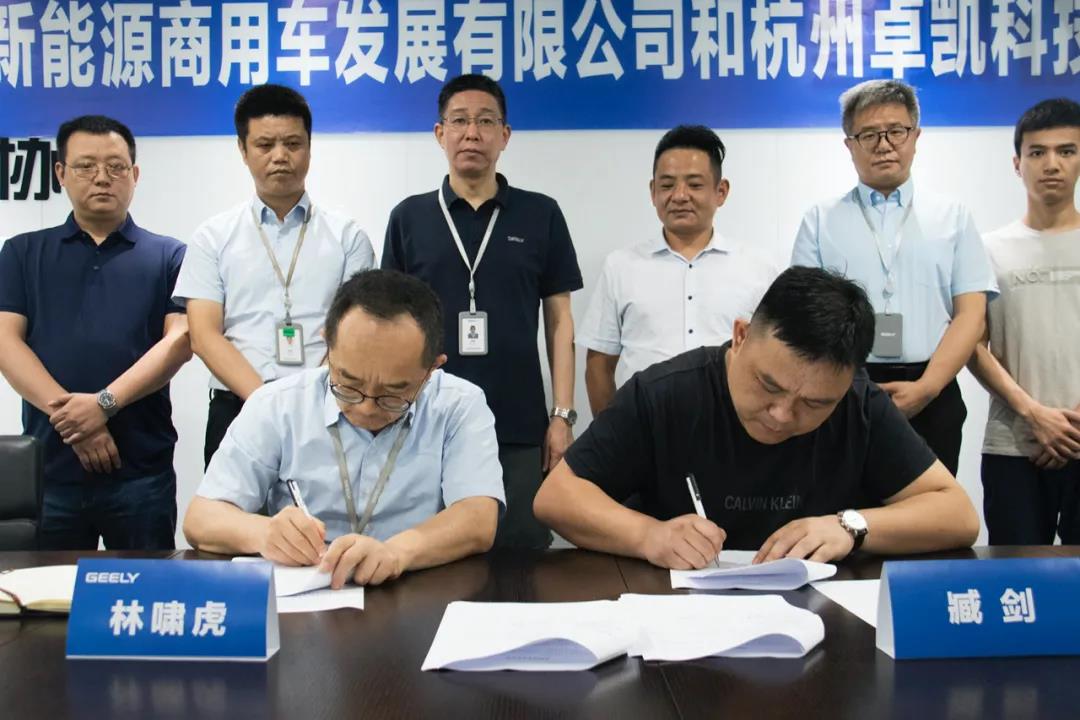 吉利商用车集团副总经理林啸虎(前左)与杭州卓凯科技董事长臧剑(前右)代表双方签约