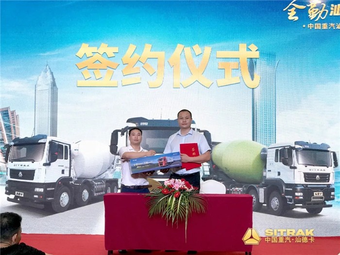 汕德卡搅拌车以“出勤高” “时效高” “寿命长” “自重轻” “运营成本低”等优势广受用户青睐!大客户现场签约订车,选择与中国重汽汕德卡共创卓越未来!