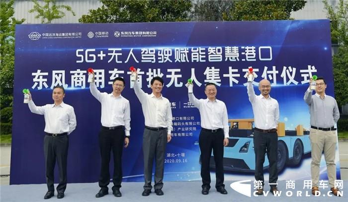 9月16日,在东风商用车车辆工厂,东风商用车有限公司将首批3辆无人驾驶集装箱卡车交付给中远海运港口有限公司。