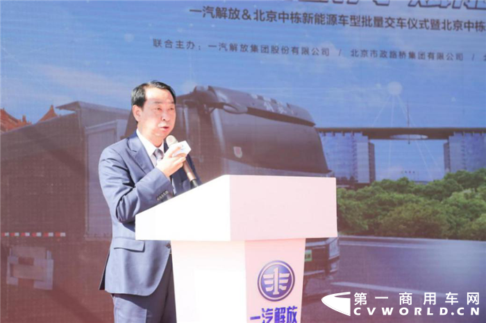 本次活动在中国第一汽车集团特种装备部副部长兼解放销售公司副总经理霍明的致辞中拉开序幕,霍总表示:继今年5月一汽解放与北京市政路桥签订战略合作协议并首批交付新能源车辆以来,双方在产品交互研发、示范运营、服务保障、车联网升级等多方面都取得了良好的进展,本次再次交付的25辆新能源纯电动沥青混合料专用车为双方合作的成果与结晶,拉升了双方合作的新高度,对双方都有重要意义。新能源车辆的批量投放被赋予了“守护绿水青山,保卫蓝天白云”的深刻内涵,诠释了中国卡车的环保信仰,表达了一汽解放支持祖国环保事业,捍卫蓝天白云的决心。”