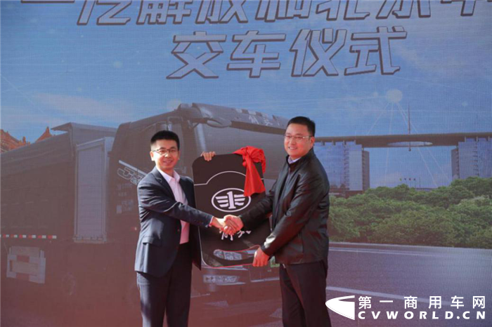 一汽解放产品管理部新能源部长裴国权与北京中栋新能源技术有限公司总经理陈晓阳进行交车仪式