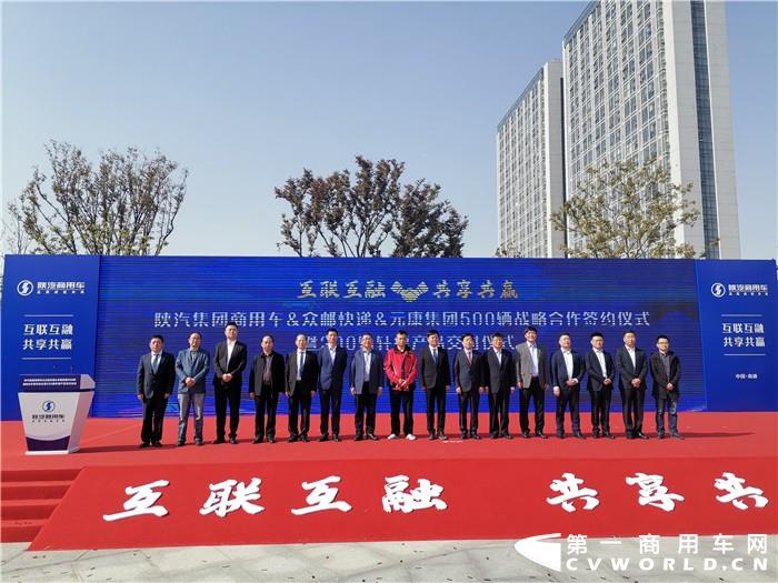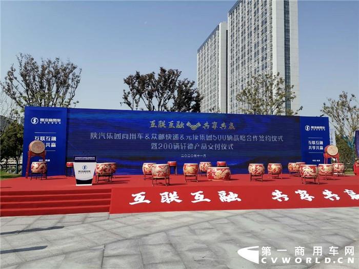11月8日,陕汽集团商用车&众邮快递&元康集团500辆战略合作签约仪式暨200辆轩德产品交付仪式在江苏南通举行。
