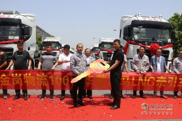 最后,在现场所有人员的见证下,葛晓生将象征财富开启的金钥匙交到了黄小平手中,标志着首批30台华菱汉马H9LNG牵引车正式交付使用。在热烈的掌声和礼炮声中,30台汉马华菱汉马H9 LNG牵引车驶向新疆,开始了它们在金岗物流的光辉征程。