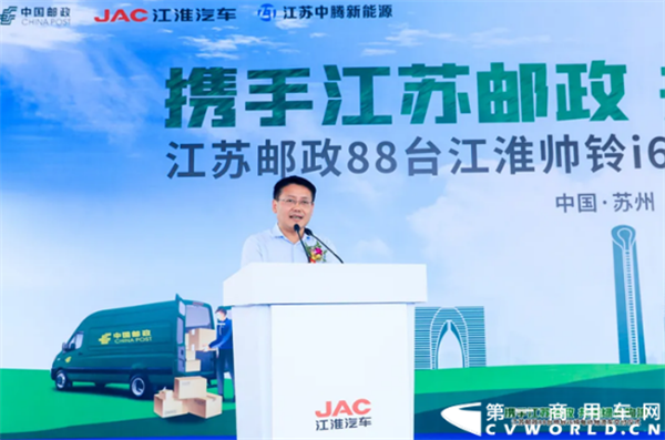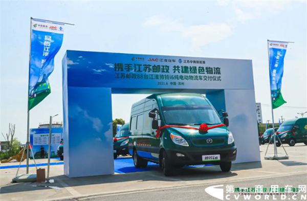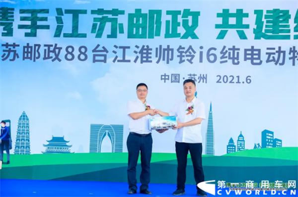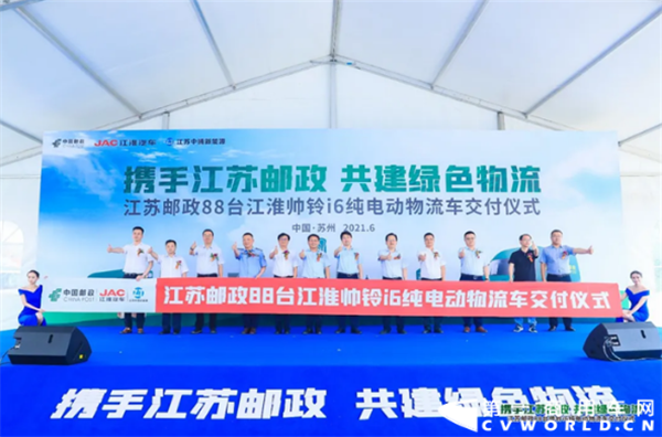 2021年6月25日,以“携手江苏邮政 共建绿色物流”为主题的江苏邮政88台江淮帅铃i6纯电动物流车交付仪式在苏州隆重举行。