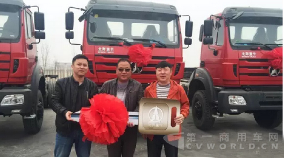 在交车仪式上,天津轲尔正总经理董博、北奔重汽销售人员向东方先科石油机械公司交付了6辆北奔重卡钥匙,并且向客户做出服务承诺。