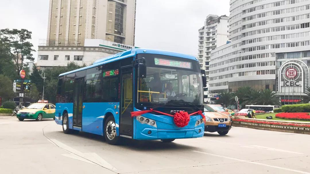 行驶在曲靖市街头的福田欧辉新能源公交车
