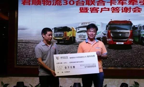 联合卡车向君顺物流赠送一万元配件支票