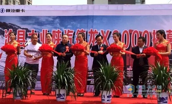 活动中,陕重汽销售公司总经理刘翔韬、潍柴石家庄办事处总经理李明琳、沧县大业汽车贸易有限公司总经理魏忠财和陕汽大客户张世义共同为陕汽德龙X3000黄金版在沧州大规模上市剪彩。