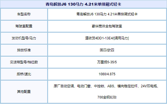 青岛解放J6 130马力 4.21米单排厢式轻卡装配豪华宽体全包驾驶室;动力方面,搭载道依茨4DD1-13E4,输出功率为[调用马力]马力,符合国四/欧四排放。匹配万里扬5-35/5变速箱。后桥采用1080/4.875。另外,该车还配备原厂自动空调、电动门窗、中控锁、ABS、横向稳定拉杆、24V双电瓶、700全钢轮胎。对该款新车有购买意向的用户欢迎致电经销商