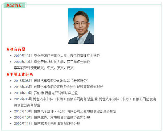 经日产(中国)投资有限公司提名推荐原东风有限财务会计总部预算管理部部长李军升任东风汽车有限公司副总裁(分管财务)。