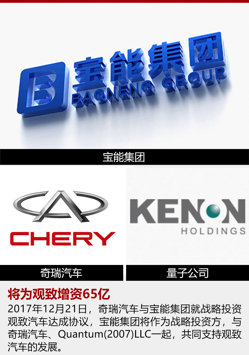 2017年,企业盈利连年亏损,销量更是一蹶不振的观致汽车找到了新的投资者。同年12月21日官方宣布,宝能集团正式战略投资观致汽车,成为观致汽车拥有绝对话语权的第三方股东(持股51%并承诺连续五年每年投入100亿作为研发资金)。