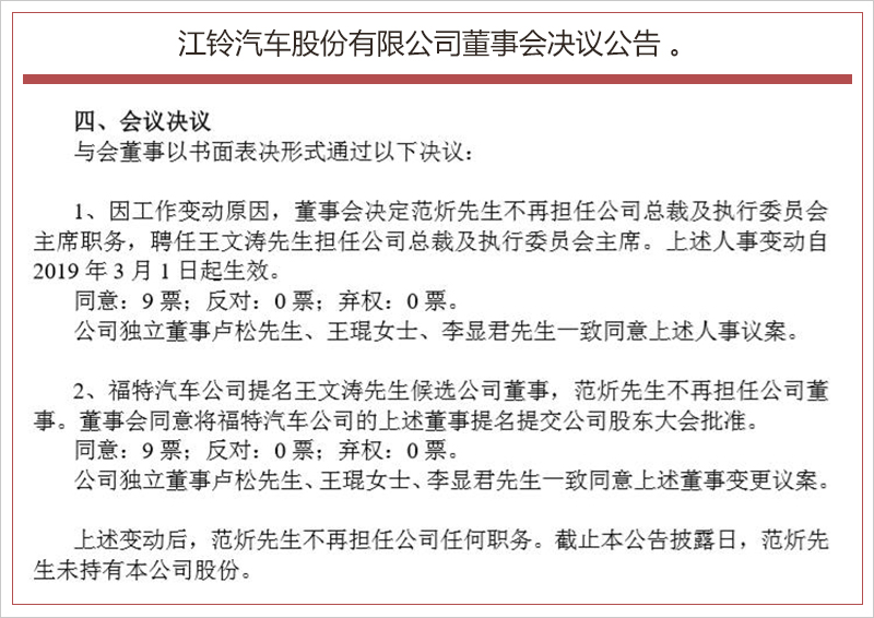 5月7日,江铃汽车发布董事会决议公告,经董事会会议决议与会董事经过讨论,董事会同意Andy Ball先生因个人原因辞去公司副总裁职务,自2019年5月1日起生效。本次辞职后,Andy Ball 先生不再在公司担任任何职务。截止该公告披露日, Andy Ball 先生未持有本公司股份。 [详细]