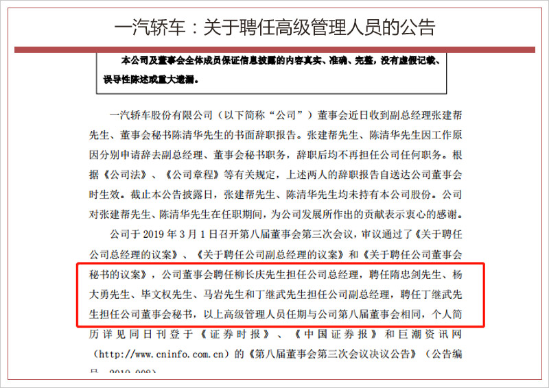 与公开竞聘之前相比,总经理职位未发生变化,仍然由柳长庆担任。然而,副总经理和董秘职位都发生了变化,此前担任一汽轿车副总经理职位的有张建帮、隋忠剑、杨大勇三人,公开竞聘后,张建帮辞职,新增了毕文权、马岩和丁继武三人。