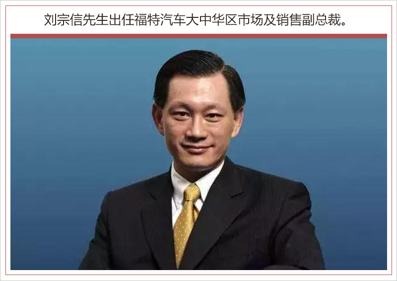 刘宗信先生出任福特汽车大中华区市场及销售副总裁,负责领导福特品牌在整个大中华地区的市场、品牌及销售管理工作。