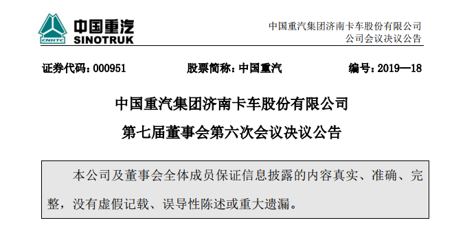中国重汽集团济南卡车股份有限公司公司会议决议公告。
