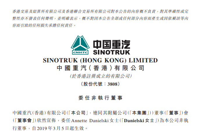 5月17日,中国重汽发布中国重汽集团济南卡车股份有限公司第七届董事会第六次会议决议公告公告。选举刘培民先生担任公司副董事长,任职自本次董事会审议通过之日起至第七届董事会届满之日止。