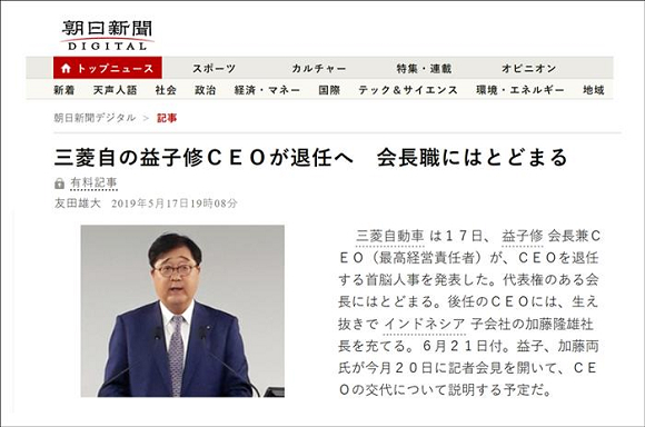 近日,据日本朝日新闻报道,三菱汽车表示,益子修(Osamu Masuko)将于6月21日辞去首席执行官一职,由印度尼西亚业务总裁加藤隆雄(Takao