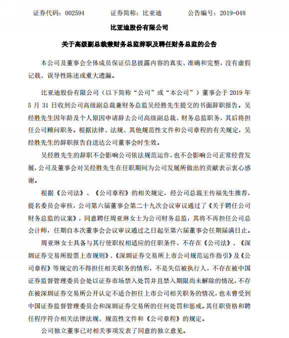 比亚迪股份有限公司(以下简称“公司”或“本公司”)董事会于2019年5月31日收到公司高级副总裁兼财务总监吴经胜先生提交的书面辞职报告。吴经胜先生因年龄及个人原因申请辞去公司高级副总裁、财务总监职务,其后将担任公司顾问职务。根据法律、法规、其他规范性文件和公司章程的有关规定,吴经胜先生的辞职报告自送达公司董事会时生效。