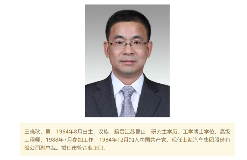 7月4日晚间,“上海发布”发布了上海市市管干部任职前公示信息,王晓秋赫然在列。公告显示:王晓秋,男,1964年8月出生,汉族,籍贯江苏昆山,研究生学历,工学博士学位,高级工程师,1988年7月参加工作,1984年12月加入中国共产党。王晓秋现任上汽集团副总裁、上汽乘用车公司总经理、技术中心主任,拟任市管企业正职。