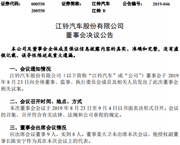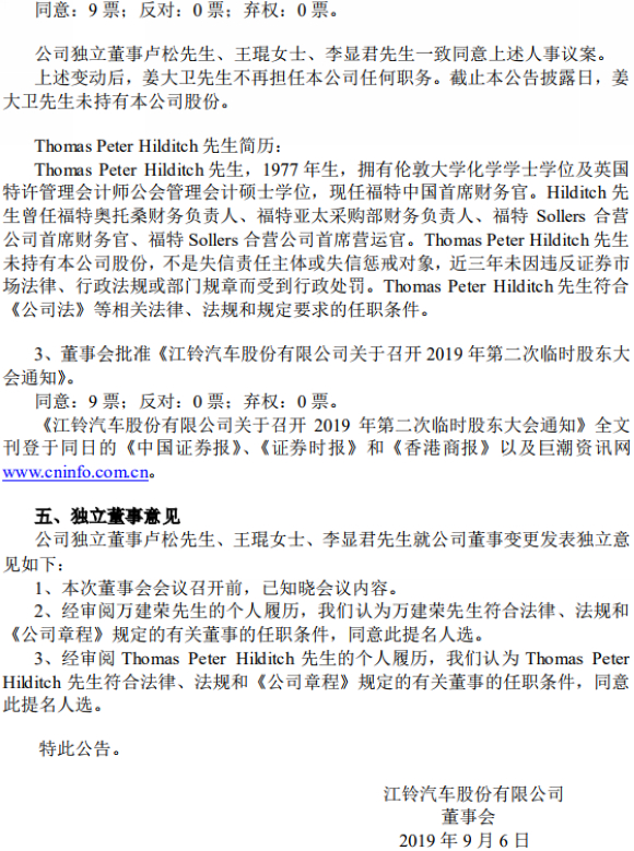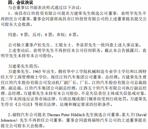 9月6日,江铃汽车发布董事会决议公告,南昌市江铃投资有限公司提名万建荣先生候选公司董事,袁明学先生不再担任公司董事;福特汽车公司提名 Thomas Peter Hilditch先生候选公司董事,姜大卫(David Johnston)先生不再担任公司董事。