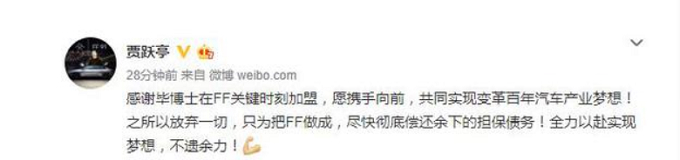贾跃亭:放弃只为把FF做成 尽快彻底偿还余下债务