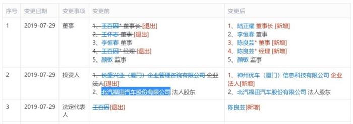 7月29日,北京宝沃汽车有限公司(以下简称宝沃汽车)工商信息出现多项变更,其中神州优车董事长陆正耀正式成为宝沃汽车董事长,原董事长王百因退出;神州优车(厦门)信息科技有限公司成为新的投资人,原投资人长盛兴业(厦门)企业管理咨询有限公司(以下简称长盛兴业)退出。