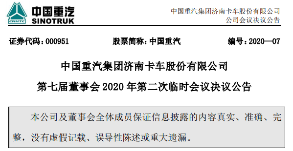 中国重汽集团济南卡车股份有限公司第七届董事会2020年第二次临时会议通知于2020年3月5日以书面送达和传真方式发出,2020年3月10日以通讯方式在公司本部会议室召开。