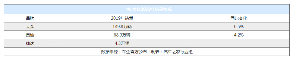 基于此,一汽-大众对2020年市场保持着较乐观态度。今年1月,一汽-大众曾对外宣布了2020年232.5万辆销量目标。其中,大众品牌2020年销量目标为142.5万辆;捷达品牌销量目标为20万辆;奥迪品牌销量目标为70万辆。