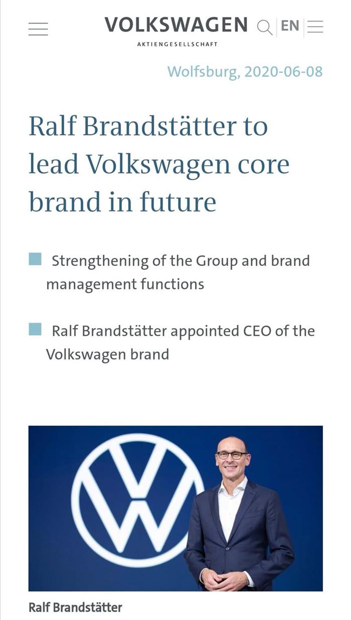 即将挂帅大众品牌的是现任首席运营官的COO拉尔夫·布兰德施泰特 (Ralf Brandstätter),而大众董事会采购和零部件领域的负责人、原采埃孚首席执行官索默博士(Stefan Sommer)将于今年6月底离开大众。
