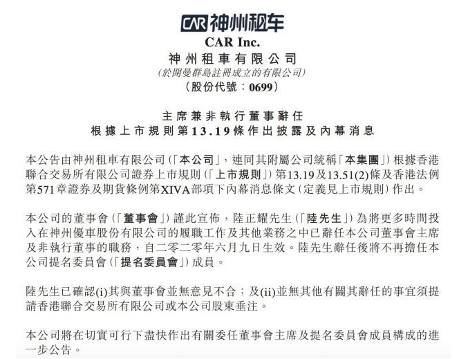 6月10日,神州租车发布公告称,陆正耀已经辞任公司董事会主席及非执行董事职务,陆正耀辞任后将不再担任公司提名委员会成员,该项任命自2020年6月9日生效。