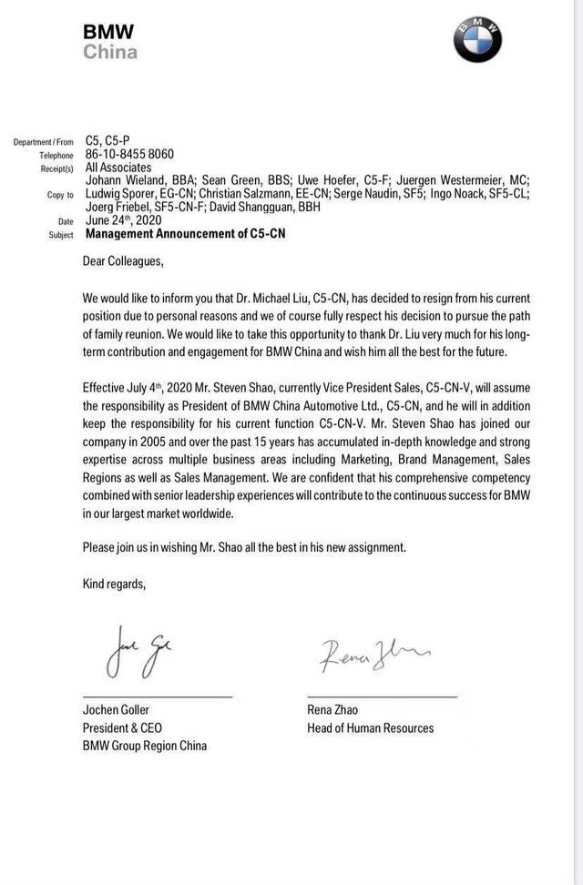 6月24日,宝马中国官方宣布,自 2020 年 7 月 4 日起,邵宾将接替刘智担任宝马(中国)汽车贸易有限公司总裁。刘智因个人原因离开公司。
