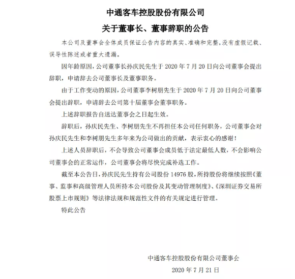 7月21日,中通客车控股股份有限公司(以下简称“公司”)发布关于董事长、董事辞职的公告:因年龄原因,公司董事长孙庆民于2020年7月20日向公司董事会提出辞职,申请辞去公司董事长及董事职务。