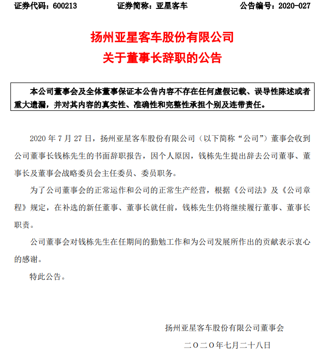 7月28日,亚星客车发布公告,因个人原因,钱栋提出辞去公司董事、董事长及董事会战略委员会主任委员、委员职务。为了公司董事会的正常运作和公司的正常生产经营,在补选的新任董事、董事长就任前,钱栋仍将继续履行董事、董事长职责。