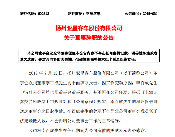 2019年7月12日,扬州亚星客车股份有限公司发布关于董事辞职的公告,扬州亚星客车股份有限公司(以下简称公司)董事会收到董事李百成先生的书面辞职报告,因工作变动原因,李百成先生申请辞去公司第七届董事会董事职务,并不再在公司任职。根据《上海证券交易所股票上市规则》和《公司章程》规定,李百成先生的辞职报告自送达董事会之日起生效。李百成先生的辞职不会导致公司董事会成员低于法定最低人数,不会影响公司董事会工作的正常运行。公司对李百成先生在任职期间为公司所做的贡献表示衷心感谢。 [详细]