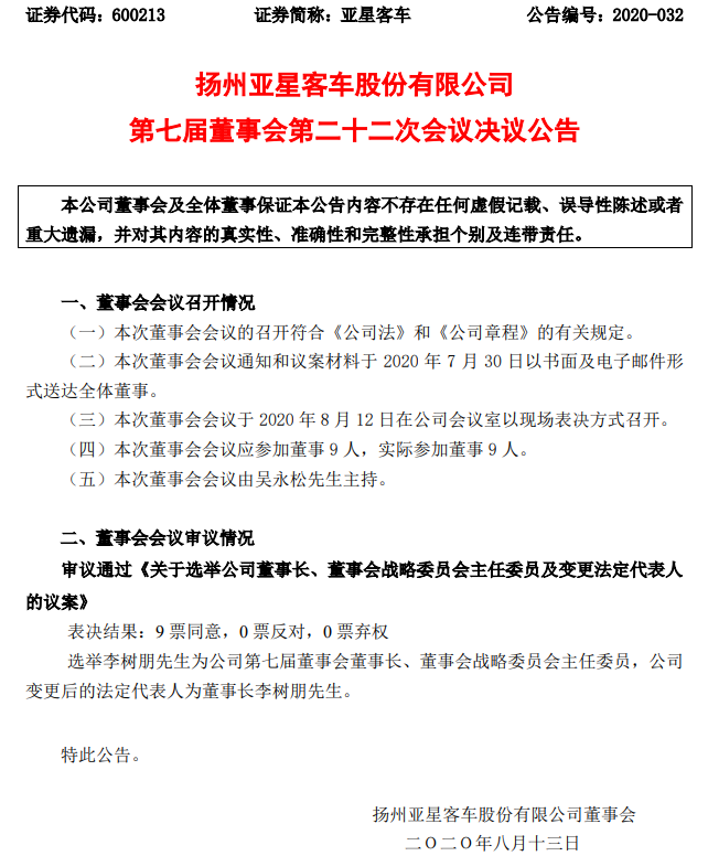 8月13日,亚星客车发布第七届董事会第二十二次会议决议公告,公告显示,公司董事会选举李树朋为公司第七届董事会董事长、董事会战略委员会主任委员,公司变更后的法定代表人为董事长李树朋。